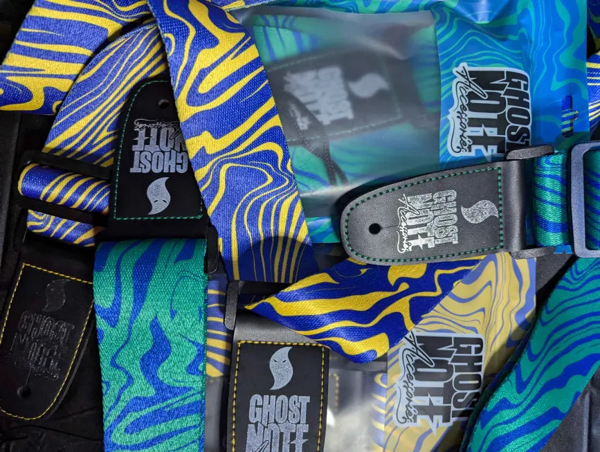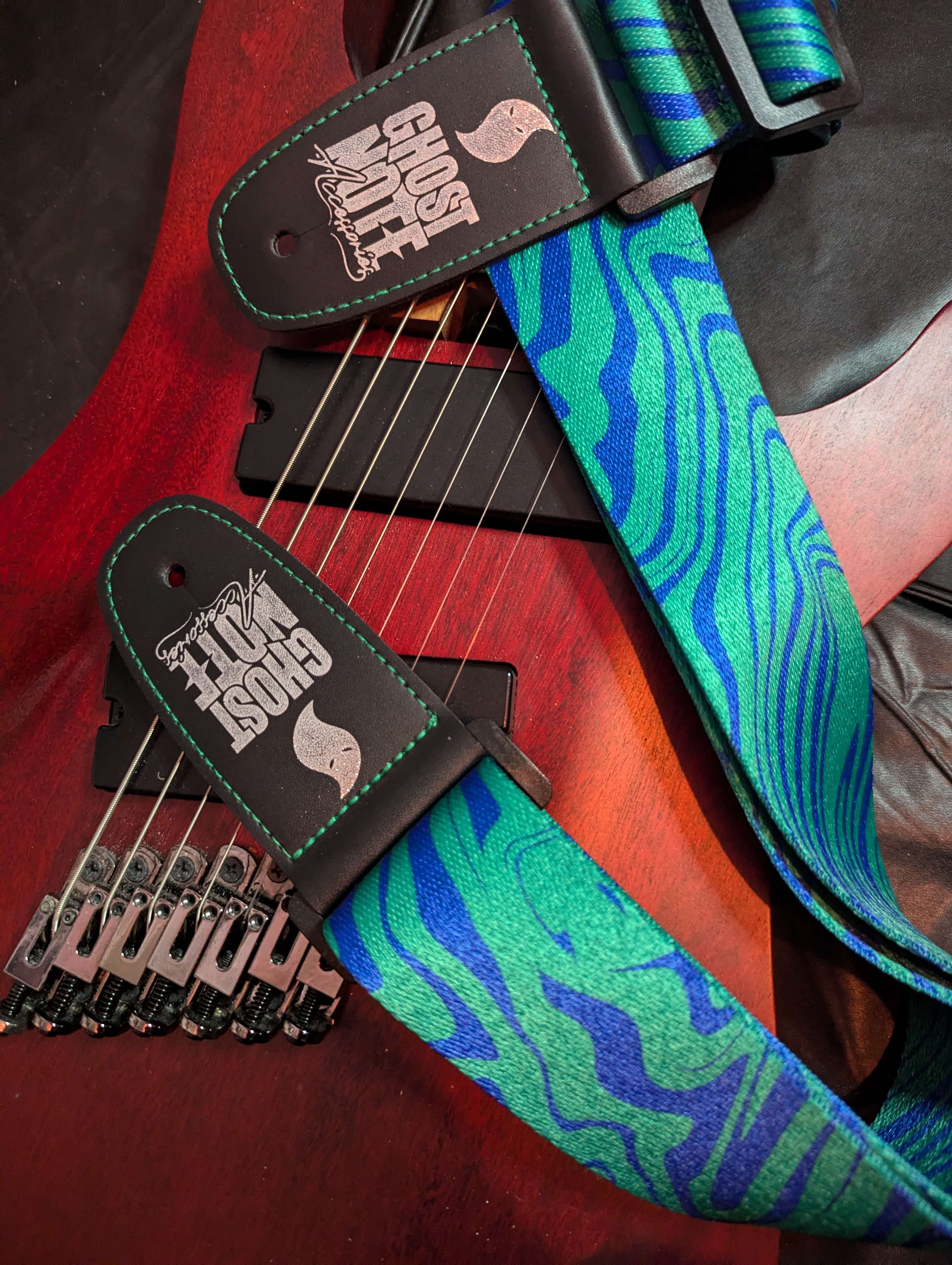 Immerse yourself in the calming yet captivating swirls of our Green on Blue guitar strap. Part of our vibrant Swirl Series, this design channels the tranquility of ocean waves with a vibrant twist, mirroring the harmony and innovation of music.